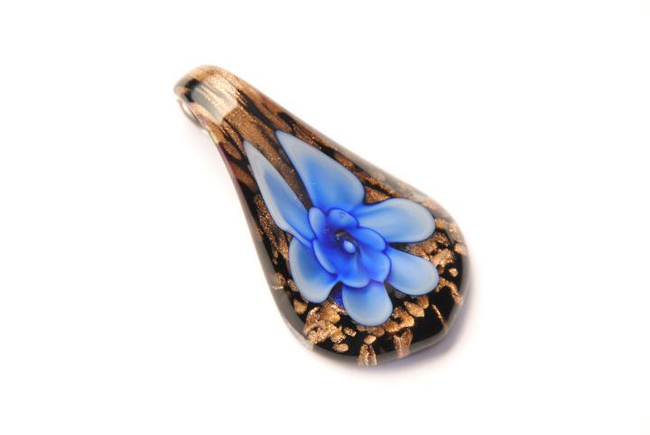 Glasschmuck aus Muranoglas: Der Glasanhänger hat die Grundfarbe schwarz-blau und ist in seiner Form einem Tropfen nachempfunden.Muranoglas Schmuck mit eingearbeiteter Blume und Goldsand.