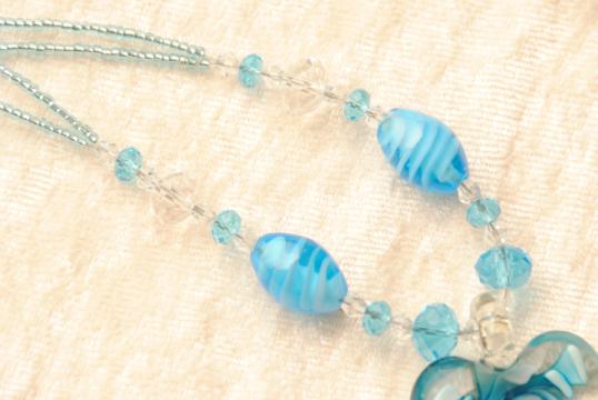 Halskette aus Glasperlen mit Muranoglas Anhänger in türkis. Herz Anhänger ca. 38mm x 40mm mit eingearbeiteter Blume.
